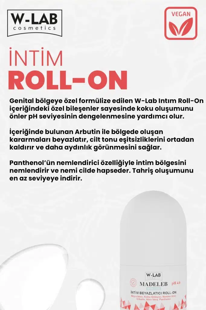 Genital bölgeye özel formülize edilen W-Lab Intim Roll-On içeriğindeki özel bileşenler sayesinde koku oluşumunu önler ve pH seviyesinin dengelenmesine yardımcı olur. İçeriğinde bulunan Arbutin ile bölgede oluşan kararmaları beyazlatır, cilt tonu eşitsizliklerini ortadan kaldırır ve daha aydınlık görünmesini sağlar. Panthenol'ün nemlendirici özelliğiyle intim bölgesini nemlendirir ve nemi cilde hapseder. Tahriş oluşumunu en az seviyeye indirir.