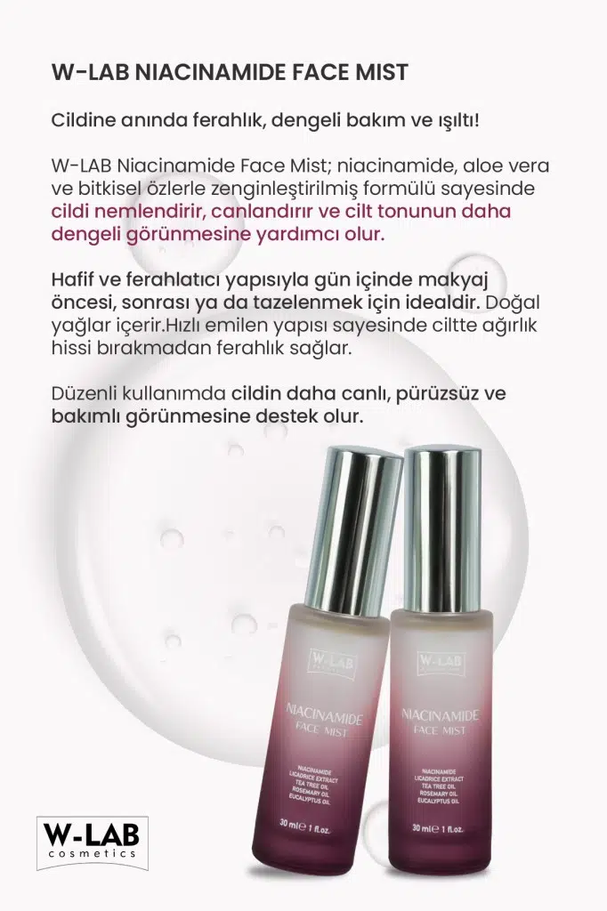 W-LAB Niacinamide Face Mist; niacinamide, aloe vera ve bitkisel özlerle zenginleştirilmiş formülü sayesinde cildi nemlendirir, canlandırır ve cilt tonunun daha dengeli görünmesine yardımcı olur.Cildine anında ferahlık, dengeli bakım ve ışıltı sağlar. Hafif ve ferahlatıcı yapısıyla gün içinde makyaj öncesi, sonrası ya da tazelenmek için idealdir. Doğal yağlar içerir.Hızlı emilen yapısı sayesinde ciltte ağırlık hissi bırakmadan ferahlık sağlar. Düzenli kullanımda cildin daha canlı, pürüzsüz ve bakımlı görünmesine destek olur.