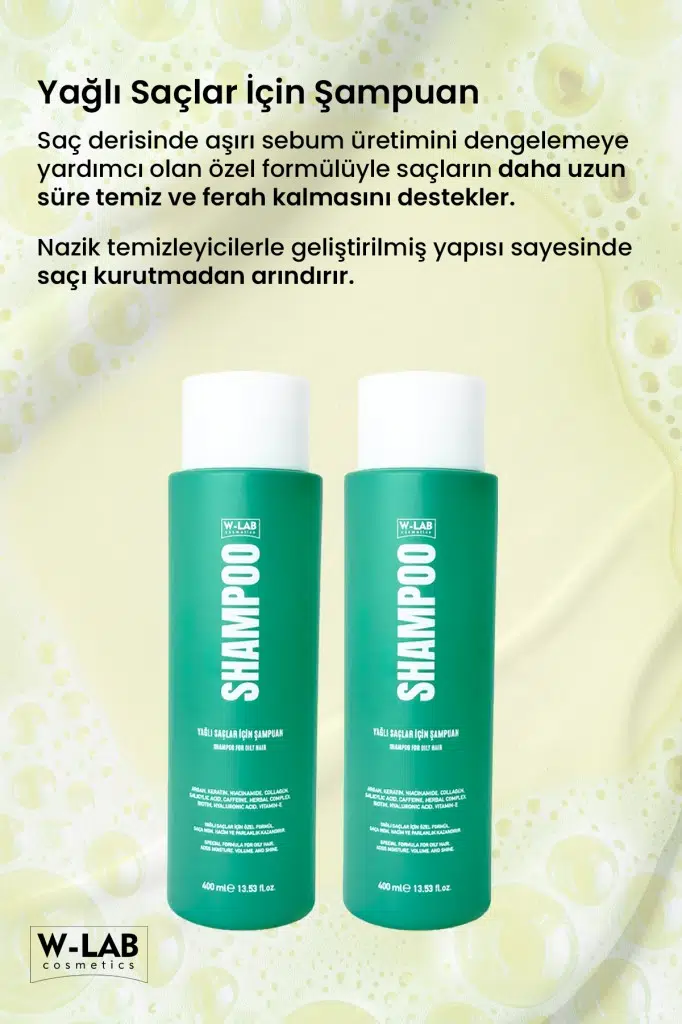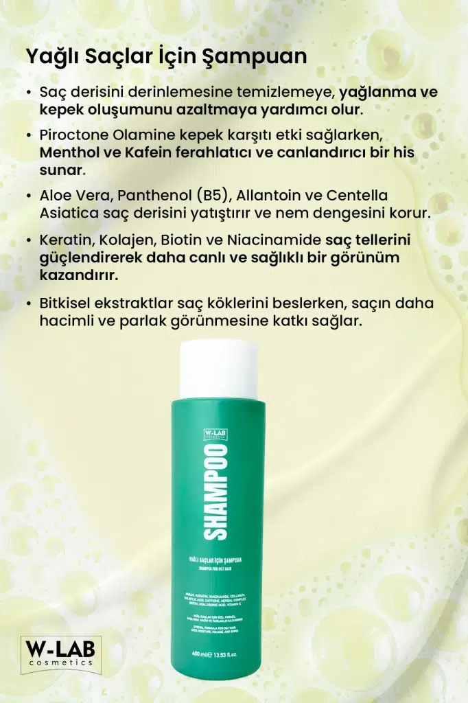 W-LAB Yağlı Saçlar İçin Şampuan, saç derisinde aşırı sebum üretimini dengelemeye yardımcı olan özel formülüyle saçların daha uzun süre temiz ve ferah kalmasını destekler. Nazik temizleyicilerle geliştirilmiş yapısı sayesinde saçı kurutmadan arındırır.