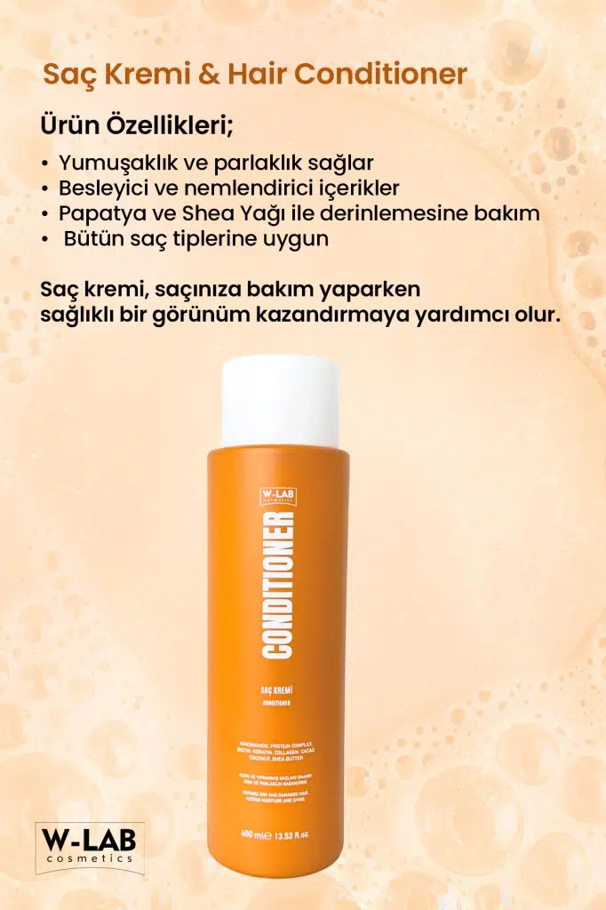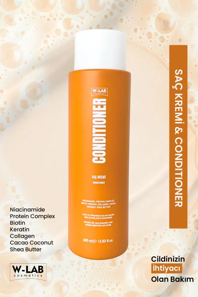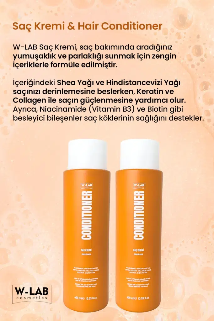 W-LAB Saç Kremi 400 ml, saç bakımında aradığınız yumuşaklık ve parlaklığı sunmak için zengin içeriklerle formüle edilmiştir. İçeriğindeki Butyrospermum Parkii Butter (Shea Yağı) ve Cocos Nucifera Oil (Hindistancevizi Yağı) saçınızı derinlemesine beslerken, Hydrolyzed Keratin ve Hydrolyzed Collagen ile saçın güçlenmesine yardımcı olur. Ayrıca, Niacinamide (Vitamin B3) ve Biotin gibi besleyici bileşenler saç köklerinin sağlığını destekler, böylece sağlıklı ve canlı bir görünüm elde edebilirsiniz.